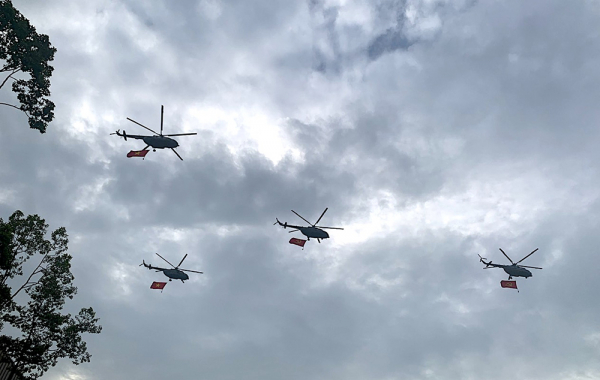 Biên đội trực thăng Mi mang cờ Đảng, cờ Tổ quốc bay trên Quảng trường Ba Đình.