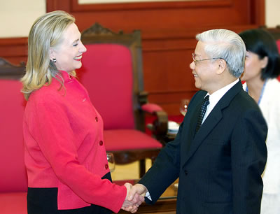 (Cadn.com.vn) - Chiều 10-7, Tổng Bí thư Nguyễn Phú Trọng và Thủ tướng Chính phủ Nguyễn Tấn Dũng tiếp Ngoại trưởng Hoa Kỳ Hillary Clinton trong chuyến thăm chính thức Việt