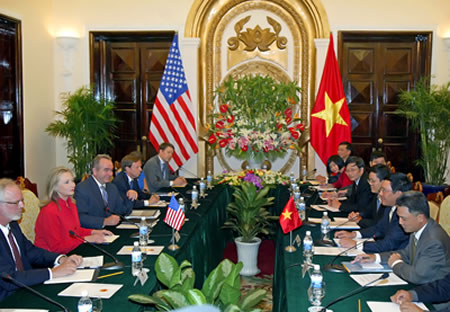 Trước đó, chiều 10-7, Ngoại trưởng Hillary Clinton đã có cuộc hội đàm với Bộ trưởng Ngoại giao Phạm Bình Minh. Tại cuộc hội đàm, hai Bộ trưởng bày tỏ hài lòng về những thành quả trong quan hệ Việt - Mỹ thời gian qua và tin tưởng quan hệ Việt-Mỹ vẫn còn nhiều tiềm năng để phát triển mạnh mẽ hơn nữa trong thời gian tới, đặc biệt trong các lĩnh vực về kinh tế, thương mại, khoa học, công nghệ, giáo dục - đào tạo... Hai bên cũng thảo luận các biện pháp hợp tác trong các lĩnh vực nhân đạo, giải quyết hậu quả chiến tranh. Hoa Kỳ nhất trí tiếp tục hỗ trợ hơn nữa trong các dự án rà phá bom mìn, tẩy độc chất độc da cam/dioxin cũng như hỗ trợ nạn nhân chất độc da cam/dioxin Việt