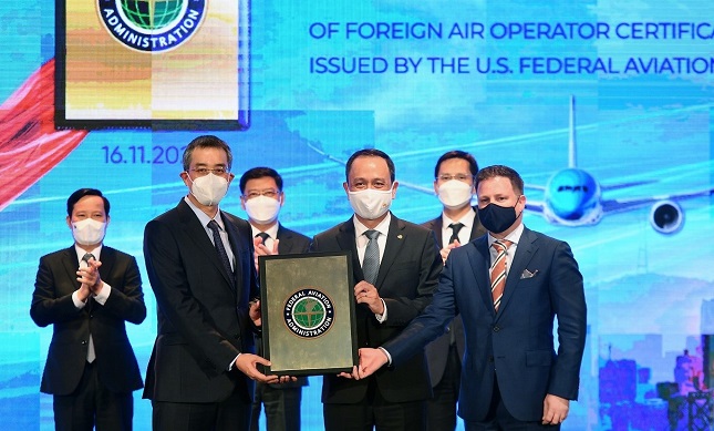 Đại diện lãnh đạo Vietnam Airlines nhận Chứng nhận bay thẳng đến Mỹ từ đại diện Cục Hàng không Liên bang Mỹ.