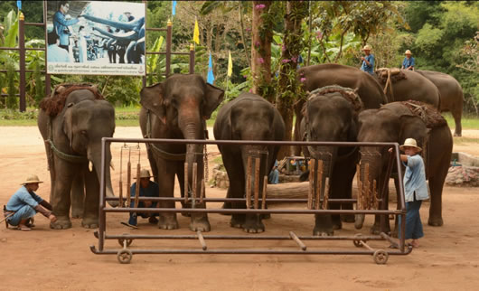 Những chú voi này chơi một bài nhạc ngắn. Đây là một bài hát tuyên truyền bảo vệ voi được sáng tác dành riêng cho Trung tâm Bảo tồn voi Lam Pang |