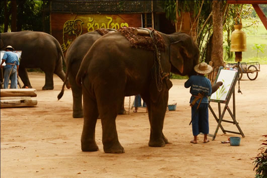 Khi các “nhạc công voi” kết thúc biểu diễn thì các “hoạ sĩ voi” xuất hiện với những cây cọ và giá vẽ. |