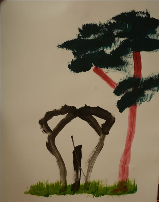 Một bức tranh do voi vẽ để lại ấn tượng mạnh với du khách. Chú voi đứng dưới gốc cây cổ thụ với dụng ý chúng không thể sống thiếu rừng |
