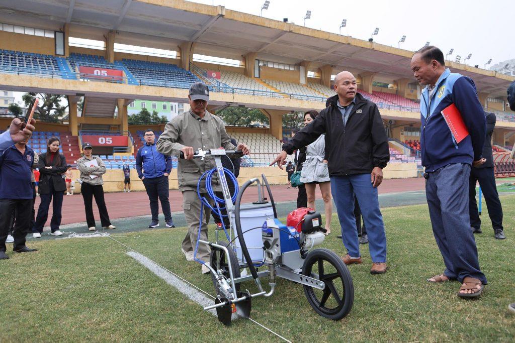 Trước khi bàn giao trang bị, chiều 15-1, VPF tổ chức tập huấn, hướng dẫn sử dụng máy phun kẻ vạch sân thi đấu cho cán bộ chuyên trách của các CLB tham dự V-League 1 tại SVĐ Hàng Đẫy (Hà Nội) với sự hướng dẫn trực tiếp từ chuyên gia kỹ thuật của nhà cung cấp.