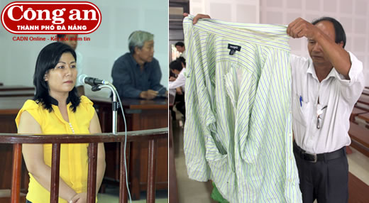 | Bị cáo Mai tại tòa và ông Ngữ trưng chiếc áo rách “tố tội” người tình một thuở. |