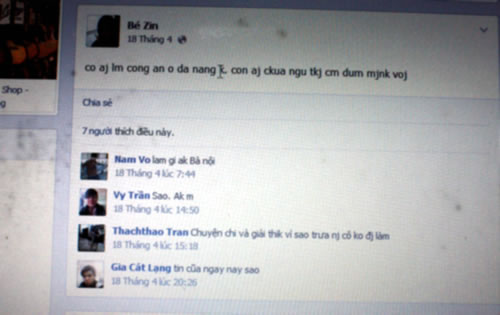 Từ tiết lộ của Tú, chúng tôi truy cập vào Facebook cá nhân của Trang có nickname là Bé Zin và biết được rằng, việc mâu thuẫn khiến Trang lo lắng, cầu cứu bạn bè. Cụ thể, trong ngày Trang bị sát hại (lúc 1 giờ ngày 18-4) trên Facebook cá nhân có thể hiện dòng tin nhắn cuối cùng: “Có ai làm công an ở Đà Nẵng không. Còn ai chưa ngủ thì comment giùm mình với”. Lời nhắn này đã được 4 người bạn của Trang chia sẻ trong ngày 18-4, trong đó sớm nhất là nicknam Vo Nam viết lúc 7 giờ 44 phút: “Làm gì à bà nội”.