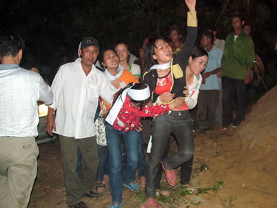 Đến 21 giờ, người nhà ông Chỉnh nhận được điện của anh Sơn cho biết xe đã về đến TP Đồng Hới (Quảng Bình) và đang đưa thi hài 2 mẹ con chị Trần Thị Trang về quê nội ở Quảng Bình an táng. 22 giờ, 4 chiếc xe chở 7 thi hài gồm bà Đào Thị Luận, chị Trần Thị Tương, anh Trần Đình Đồng, chị Nguyễn Thị Phượng cùng 3 đứa cháu nội, ngoại về đến Nghĩa trang núi Đòn Gánh trong không khí ảm đạm, tang thương. Trong đêm tối, nghĩa trang núi Đòn Gánh u tịch đến lạnh người. Những bước chân mệt mỏi, từng người, từng người dìu nhau tiến về nghĩa trang trong tiếng khóc khản đặc: “Bà ơi, mẹ ơi, con ơi...”. Phía trên ngọn đồi từng cơn gió thổi mạnh như rít bên tai, khói nhang nghi ngút cả một vùng trời.