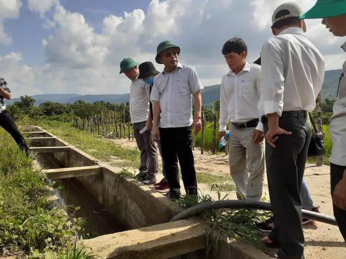 Lãnh đạo huyện Chư Sê kiểm tra quá trình sửa chữa công trình thủy lợi Plei Keo. |