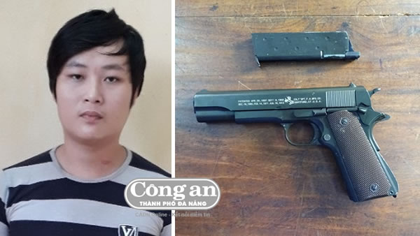 Đoàn Ngọc Huy và khẩu súng dùng để bắn Hồ Anh Líp. |