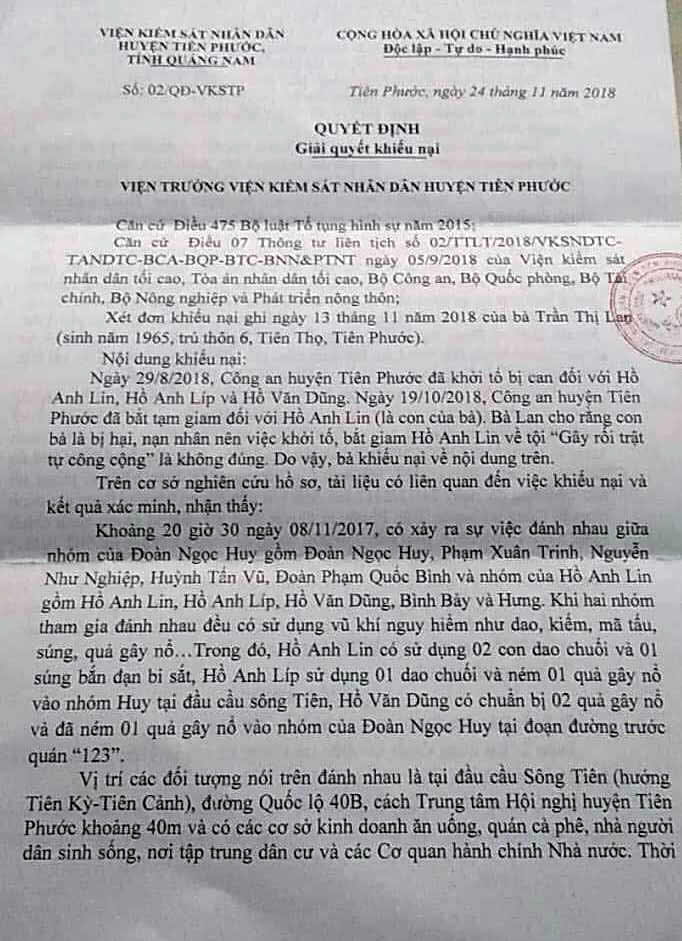 Trước đơn trình bày của bà Lan, ngày 24-11-2018, VKSND H. Tiên Phước có Thông báo quyết định giải quyết khiếu nại số 02/QĐ-VKSTP liên quan đến vụ án trên. Nội dung thông báo nêu: Trên cơ sở nghiên cứu hồ sơ, tài liệu có liên quan đến việc khiếu nại và kết quả xác minh, VKSND H. Tiên Phước cho rằng, việc sử dụng vũ khí nguy hiểm của hai nhóm nói trên để tham gia đánh nhau khiến người dân xung quanh không dám đến xem vì sợ bị thương tích; việc ném mìn đã tạo ra tiếng nổ lớn vang xa hơn 1km gây hoang mang, lo sợ trong nhân dân. Nhiều hộ dân cho rằng các đối tượng tham gia đánh nhau đã xem thường pháp luật, làm ảnh hưởng xấu đến tình hình ANTT tại địa phương, ảnh hưởng nghiêm trọng đến trật tự an toàn xã hội... Trước sự việc trên, Cơ quan CSĐT CAH Tiên Phước đã khởi tố Đoàn Ngọc Huy, Nguyễn Như Nghiệp, Huỳnh Tấn Vũ, Đoàn Phạm Quốc Bình, Hồ Anh Lin, Hồ Anh Líp, Hồ Văn Dũng về tội “Gây rối trật tự công cộng” là đúng theo quy định...