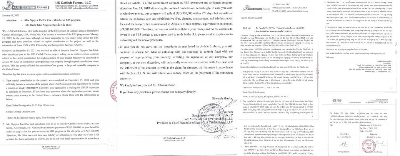 Theo nội dung công văn trên - được gửi ngày 3-1 cho ông Khải và bà Vân thể hiện: Chúng tôi - Công ty US Catfish Farms, LLC là chủ đầu tư dự án EB-5 của Catfish Farms tại Hạt Hamphreys, Bang Mississippi, Hoa Kỳ, là dự án mà bà Nguyễn Thị Từ Vân đã trở thành thành viên của Chương trình EB-5 vào ngày 15-2-2019. Thời gian qua mặc dù chúng tôi đã nhiều lần phản hồi đến bà về chương trình EB-5 và những thắc mắc của bà liên quan đến việc góp vốn vào dự án, cũng như việc nộp đơn mẫu I-526 tại Sở Nhập tịch và Di trú Hoa Kỳ. Tuy nhiên, ngày 13-12-2021, chúng tôi có nhận được công văn của ông Nguyễn Tấn Khải - là bên đã giới thiệu bà tham gia dự án EB-5 về việc đề nghị chúng tôi xác nhận một số nội dung liên quan đến việc góp vốn thực hiện dự án của bà do bà tiếp tục tố cáo ông Khải có hành vi lừa đảo chiếm đoạt tài sản của bà thông qua việc góp vốn vào dự án của chúng tôi. Việc này đã ảnh hưởng rất lớn đến uy tín của tập đoàn chúng tôi - một công ty lớn và có uy tín tại Hoa Kỳ.