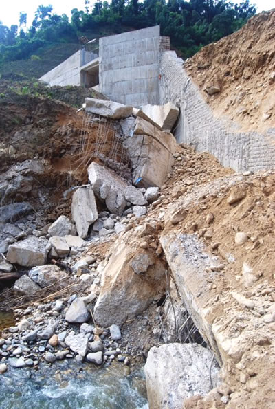 Hiện trường ngổn ngang tại tường thượng lưu thủy điện Đăk Mek 3. |