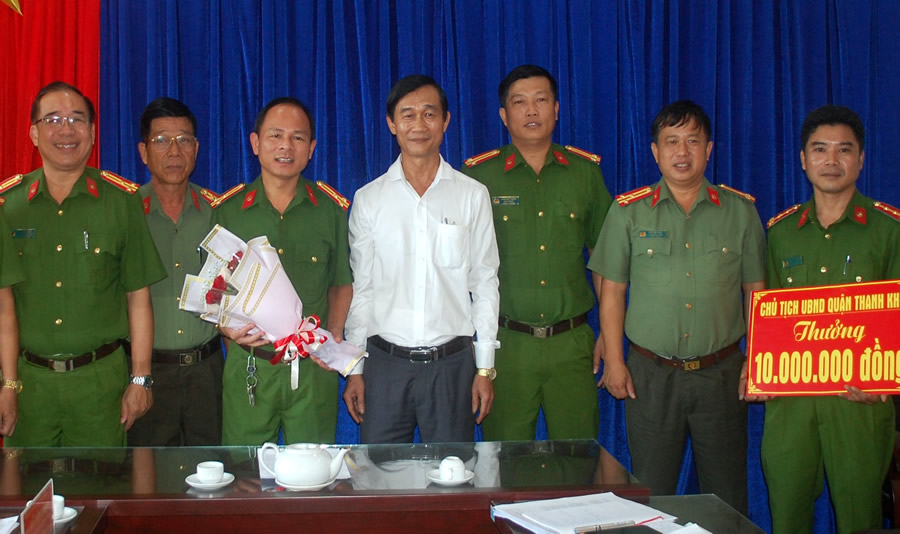 Chủ tịch UBND Q. Thanh Khê Nguyễn Văn Tĩnh khen thưởng đột xuất thành tích khám phá thành công chuyên án của Đội CSHS. |