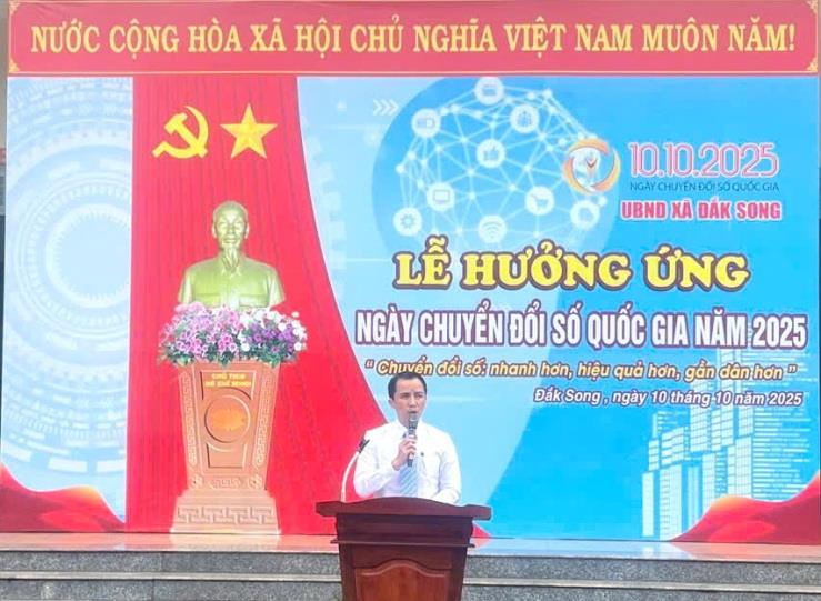 Hưởng ứng Ngày Chuyển đổi số quốc gia (10/10) với chủ đề “Chuyển đổi số: nhanh hơn, hiệu quả hơn, gần dân hơn”, UBND xã Đắk Song, tỉnh Lâm Đồng đã tổ chức ra quân diễu hành tuyên truyền hưởng ứng Ngày Chuyển đổi số quốc gia (10/10/) và phong trào “Bình dân học vụ số” năm 2025. Tham dự buổi lễ có đồng chí Niê Sơ Nghiêm, Phó Bí thư Thường trực Đảng ủy xã, đồng chí Nguyễn Ngọc Thân, Phó Bí thư Đảng ủy, Chủ tịch UBND xã; các đồng chí trong Ban Chấp hành, Ban Thường vụ Đảng ủy xã; đại điện các ban, ngành, đoàn thể, trường học, Tổ công nghệ số cộng đồng tại 11 thôn, bon và Nhân dân trên địa bàn xã.