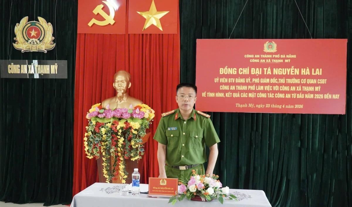 Chiều 23-4, Đại tá Nguyễn Hà Lai, Phó Giám đốc, Thủ trưởng Cơ quan CSĐT Công an thành phố Đà Nẵng làm việc với Công an xã Thạnh Mỹ về kết quả công tác bảo đảm an ninh trật tự từ đầu năm 2026 đến nay.