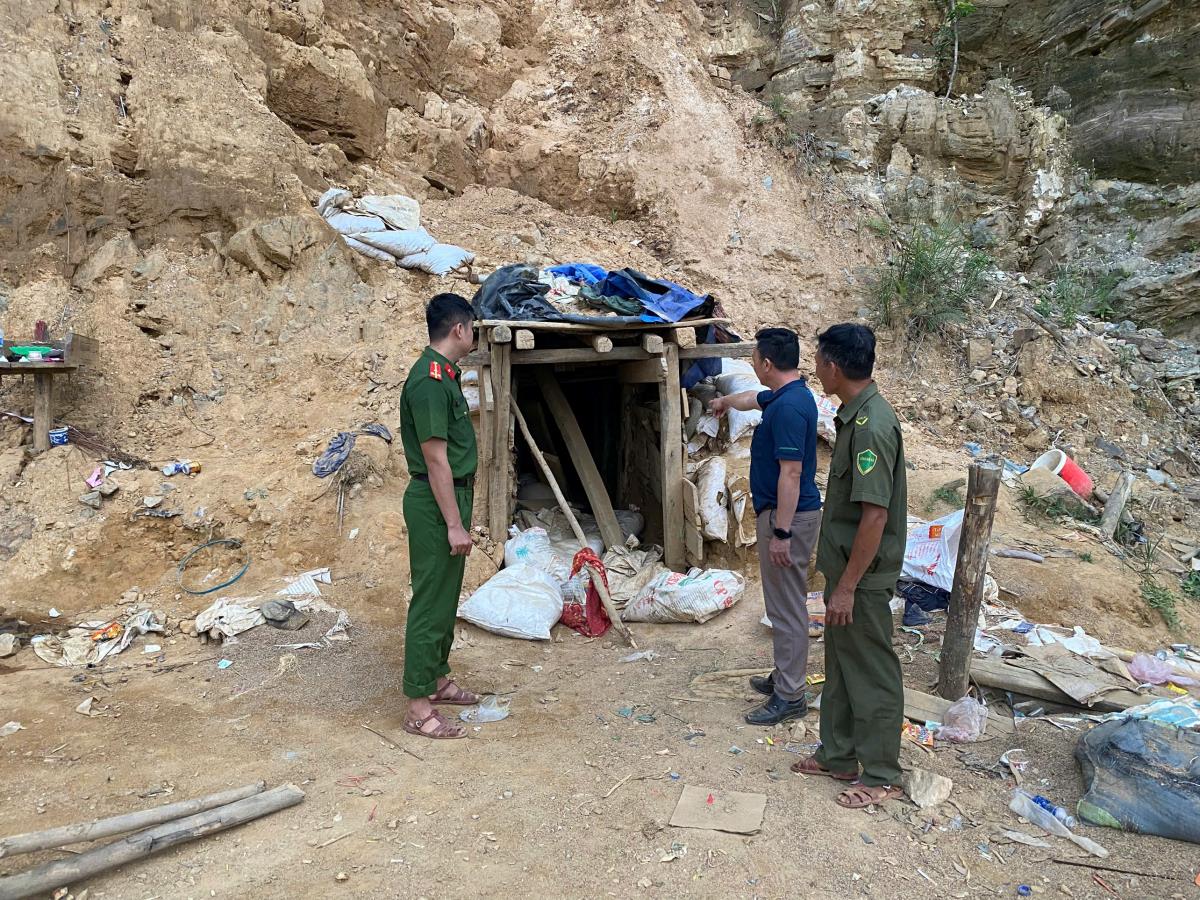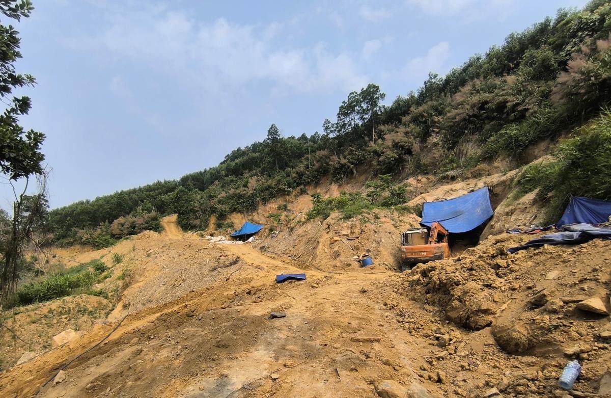 Tiến hành kiểm tra tại hiện trường, khu vực khai thác có diện tích khoảng 1.000 m2 bị đào xới nham nhở, địa hình đồi đất bị biến dạng, có 2 hầm được đào sẵn trước đó; tại cửa hầm có 14 bao quặng có khối lượng 262,5 kg; xung quanh khu vực phát hiện có 3 máy phát điện, 3 máy nổ, 2 máy bơm không khí vào hầm được chôn lấp dưới các hố sâu, 1 khu láng trại bên trong có 2 máy cưa lốc và nhiều vật dụng sinh hoạt khác, không có khu vực tuyển quặng. Cách khu vực khai thác khoảng 1 km, phát hiện 1 xe máy đào màu cam, bánh xích, không có người điều khiển.