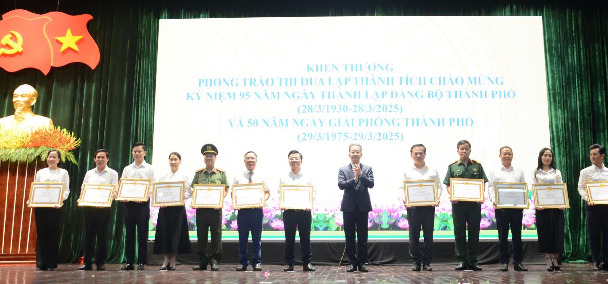 Tại Hội nghị, có 17 tập thể và cá nhân có thành tích xuất sắc về thực hiện Chỉ thị 34 được Ban Thường vụ Thành ủy tặng Bằng khen; 47 tập thể và cá nhân có thành tích xuất sắc trong các mặt công tác dịp kỷ niệm 95 năm ngày thành lập Đảng bộ TP và 50 năm ngày giải phóng TP được Chủ tịch UBND TP tặng Bằng khen.