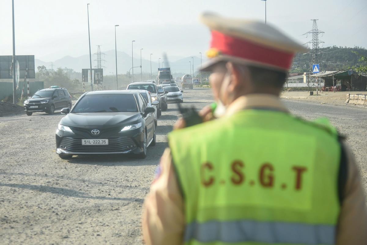 Trong khi đó, dù đã có lực lượng chức năng phân luồng, điều tiết giao thông, ùn ứ vẫn kéo dài hơn 1km tại khu vực giao giữa lối ra cao tốc Hòa Liên - Túy Loan và nút giao cao tốc Đà Nẵng - Quảng Ngãi. Anh Võ Huy Hoàng, tài xế xe tải chạy tuyến Hà Nội – TP Hồ Chí Minh mệt mỏi cho biết, anh đã phải di chuyển trong tình trạng nhích từng chút một kéo dài gần 2km. Việc lối ra của cao tốc Hòa Liên - Túy Loan giao với đường dẫn vào cao tốc Đà Nẵng - Quảng Ngãi có hình dạng cổ chai đã khiến tình trạng ùn ứ mỗi dịp lễ Tết diễn ra tại khu vực này một cách phổ biến. Dù đã có lực lượng chức năng phân luồng, điều tiết giao thông nhưng tình trạng ùn ứ vẫn kéo dài. "Dọc tuyến Bắc – Nam, tôi chưa thấy cao tốc nào "lạ" như thế này. Chỉ có 2 làn đường, không có dải phân cách, tốc độ cho phép lại 50km/ giờ. Ai đi qua đây cũng ức chế", anh Hoàng mệt mỏi.
