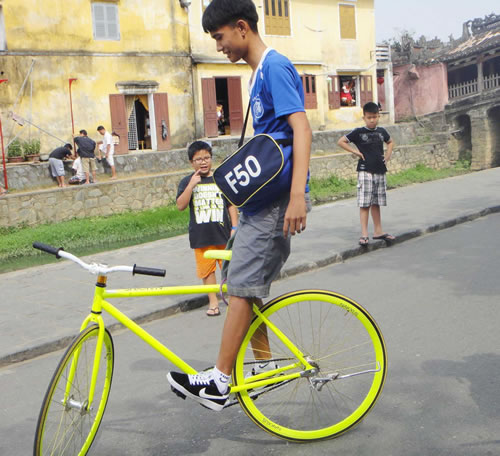 Trung Nghĩa (quê Tam Kỳ, Quảng Nam) hiện là Chủ nhiệm một CLB xe Fixed- gear tại Đà Nẵng, chia sẻ: “Xe đạp Fixed- gear, còn gọi là Fixie, dùng để chỉ chiếc xe đạp không có phanh, bánh răng sau được bắt chết vào bánh, người lái xe này không cần sử dụng phanh mà sử dụng sức chân và bàn đạp để giảm tốc độ. Fixed- gear tương tự như xích lô, không hề có vòng bi sau khiến bánh xe hoàn toàn quay theo sự điều khiển của người lái. Em thành lập CLB này đến nay trong một tháng với mong muốn tạo sân chơi cho những bạn đam mê, yêu thích fixed-gear. Vào những ngày cuối tuần, chúng em thường đạp xe về Hội An chơi, và tổ chức nhiều cuộc thi, điều này giúp chúng em rèn luyện sức khỏe, luyện thêm nhiều kỹ năng mới...”.