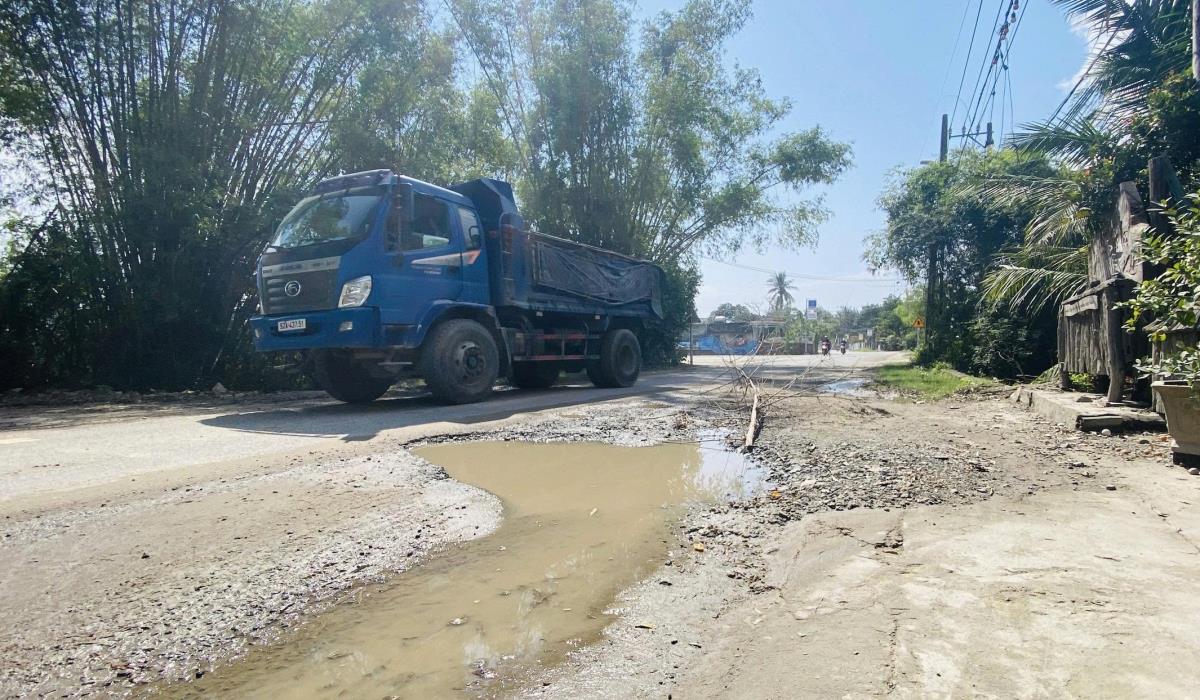 Ghi nhận thực tế ngày 13-1 cho thấy, tuyến tỉnh lộ 607B dài khoảng hơn 4km, mặt đường rộng chừng 7,5m nhưng đang phải “gánh” lượng phương tiện tải trọng lớn vượt xa khả năng chịu tải. Từng đoàn xe tải chở đất đá, vật liệu xây dựng, xe container ầm ầm lao qua, cuốn theo bụi đất bay mù mịt, phủ kín cả tuyến đường và khu dân cư hai bên. Nhiều đoạn mặt đường bong tróc lớp nhựa, lún sâu, nứt vỡ, hình thành hàng loạt “ổ gà”, “ổ voi”. Có những vị trí hư hỏng kéo dài, mặt đường biến dạng nghiêm trọng khiến các phương tiện nhỏ như xe máy, xe đạp phải luồn lách, né tránh trong tình trạng hết sức nguy hiểm vì những xe tải trọng lớn gần như chiếm trọn lòng đường.