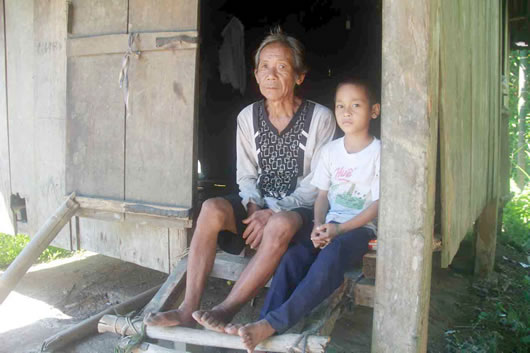 Hai ông cháu Hằng trong căn nhà sàn nhỏ. |