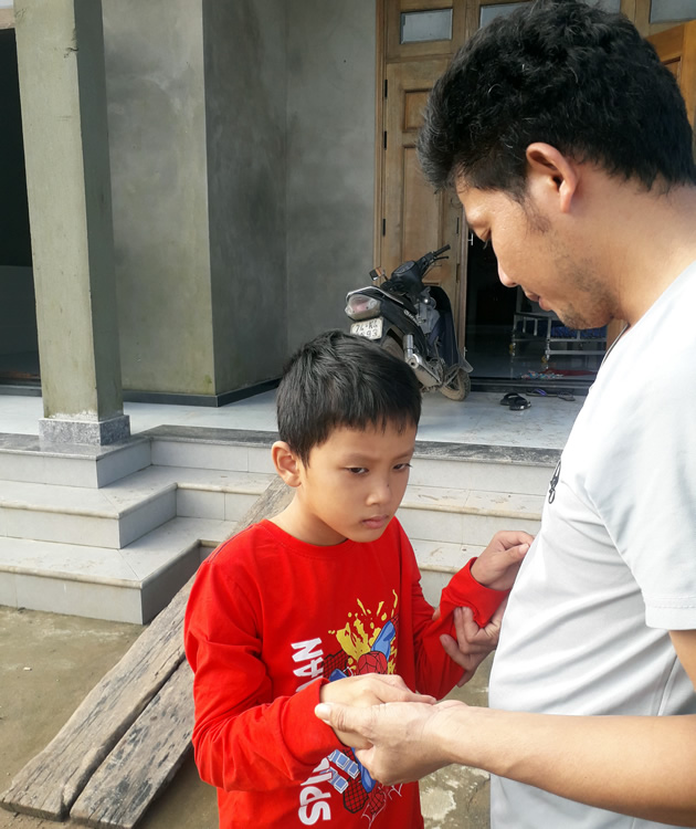 Ngày 18-11, đúng tròn 1 tháng sau cơn lũ lịch sử lớn nhất 40 năm qua tại Quảng Trị, nước vẫn bao vây xóm nhỏ nhà gần sông Ái Tử ở thôn Trà Liên Tây, xã Triệu Giang, H.Triệu Phong khiến lối vào nhà anh Cao Hữu Trí (35 tuổi) phải đi đường vòng rồi băng qua khu mộ địa cũng bùn lầy không kém. Ngôi nhà cấp 4 của gia đình anh Trí quay mặt về hướng đông, tường chưa sơn quét còn in dấu vết ngập lũ. Từ xa, chúng tôi đã thấy anh Trí dìu con trai Cao Hữu Dũng ra sân tập đi trong nắng ấm. Dũng sinh năm 2011, là con trai đầu của vợ chồng chị Thanh Nhàn - anh Trí, cháu học lớp 4A, là 1 trong hàng chục nạn nhân trên địa bàn tỉnh Quảng Trị bị thương nặng trong cơn lũ dữ, đầy ám ảnh.