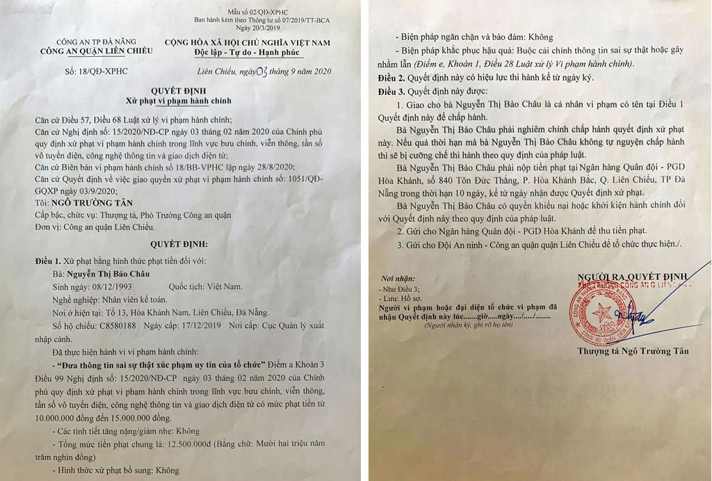 Quyết định xử phạt hành chính đối với bà Châu. |