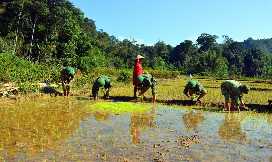 | Đại úy Ui cùng đồng đội giúp dân trồng lúa nước. |