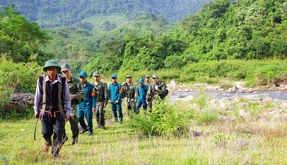 Già Alăng Nhứch cùng lực lượng dân quân xã và chiến sĩ Đồn Biên phòng La Êê trên đường tuần tra cột mốc. |