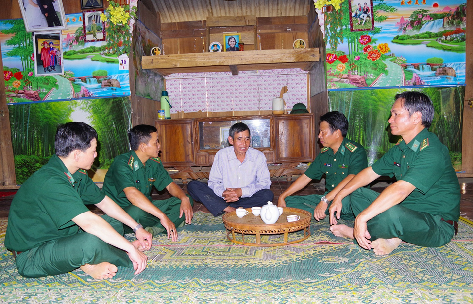 Lãnh đạo Đồn Biên phòng La Êê trao đổi tình hình trên địa bàn với già Alăng Nhứch. |