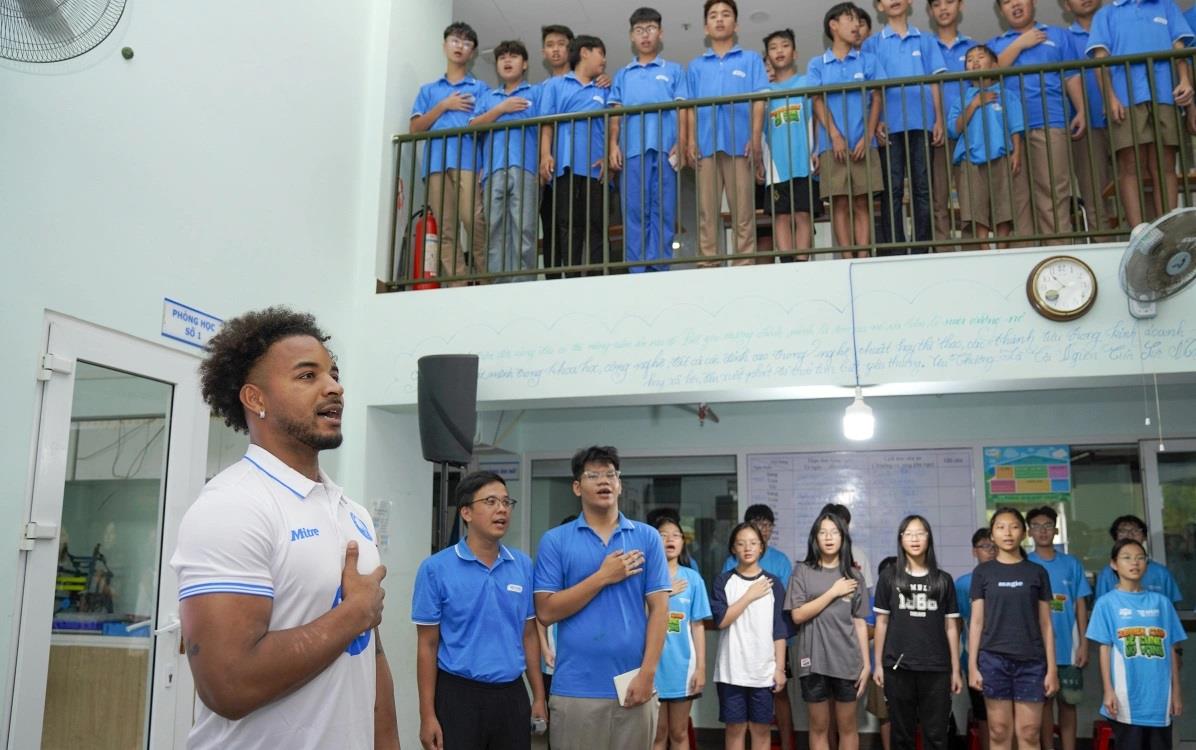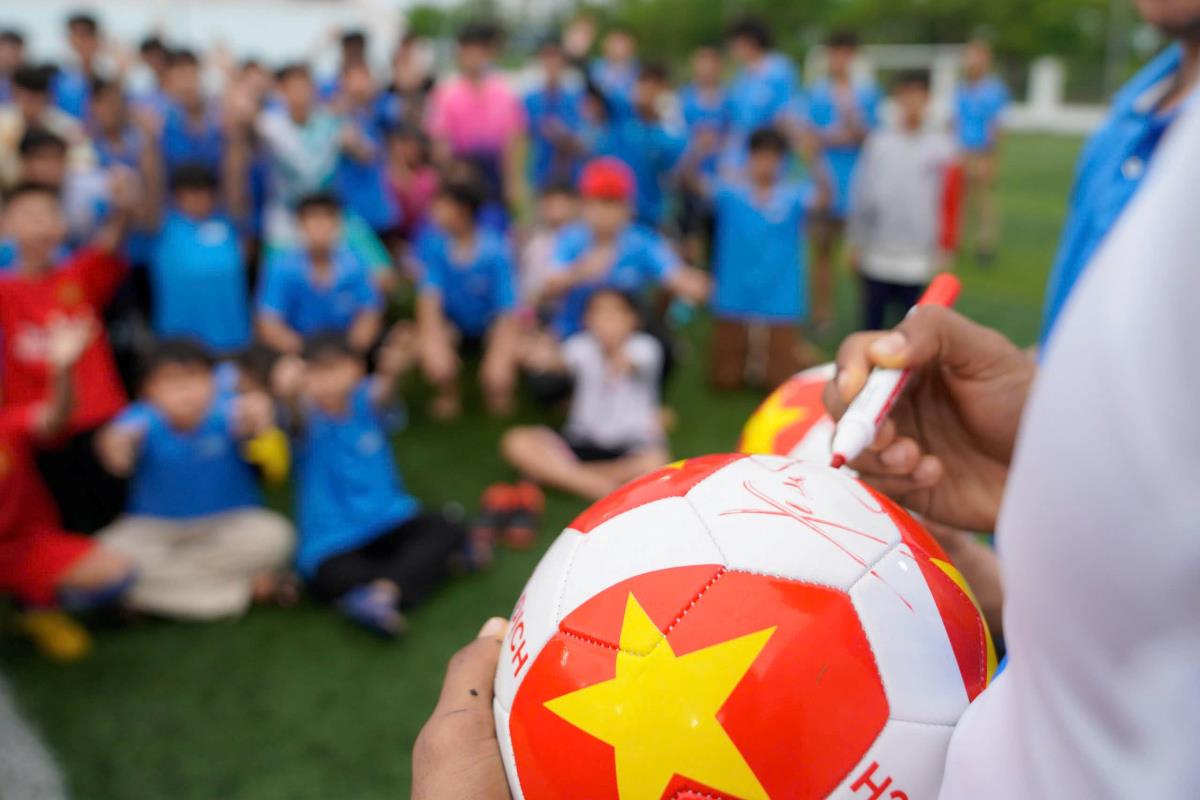 Trước đó chiều 13-6, nam cầu thủ đến thăm khu nội trú của hơn 300 học sinh Trường Hy Vọng. Các em nhỏ chào đón, vây quanh anh để xin chữ ký.