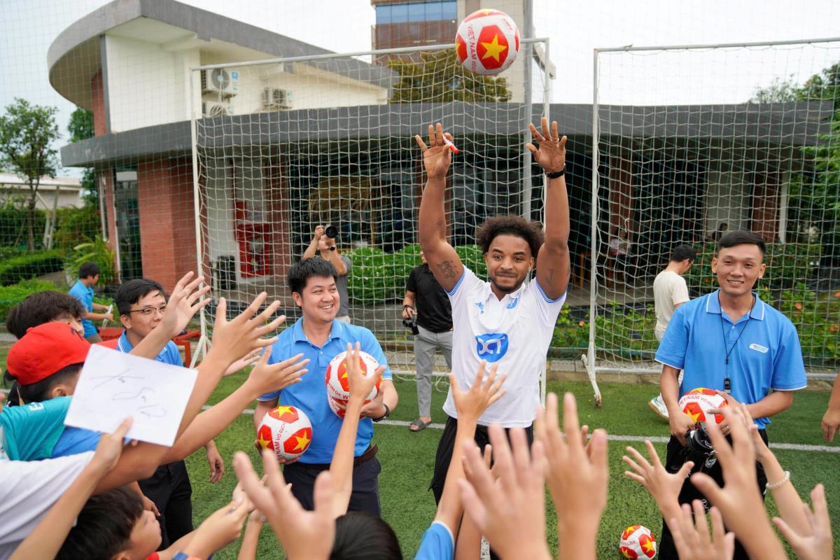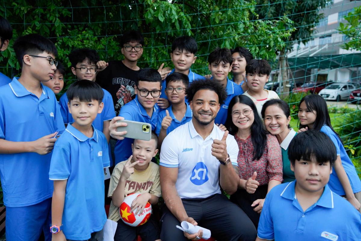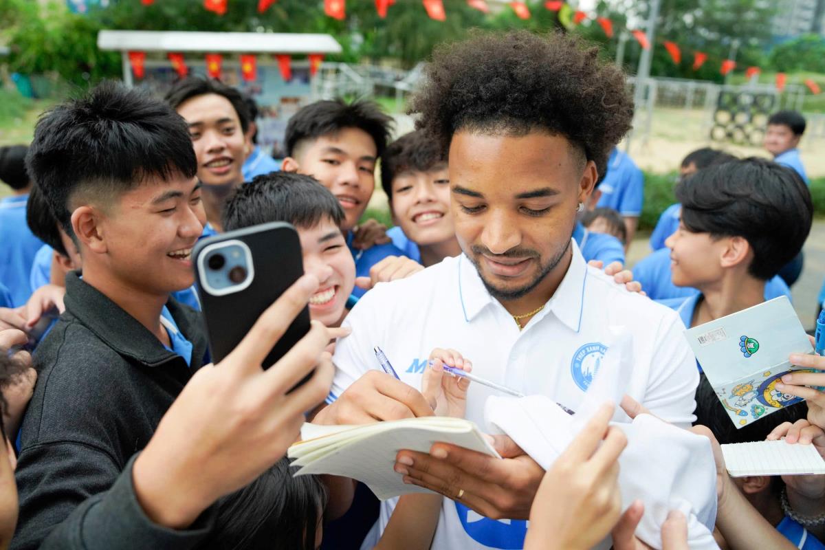 Rất thân thiện, tiền đạo gốc Brazil chụp hình lưu niệm cùng các em nhỏ, các thầy cô trong trường hay những người hâm mộ tham gia sự kiện
