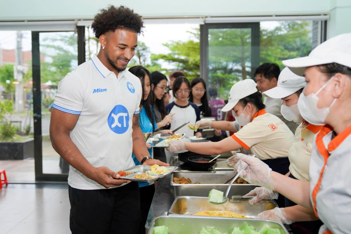 Chỉ trong một thời gian ngắn, nhiều em nhỏ đã thể hiện sự thân quen, mạnh dạn mời "thần tượng" của mình cùng ăn cơm tối. Nguyễn Xuân Son nhận lời, cùng xếp hàng, nhận khay thức ăn và có trải nghiệm bữa cơm của học sinh trường Hy vọng.