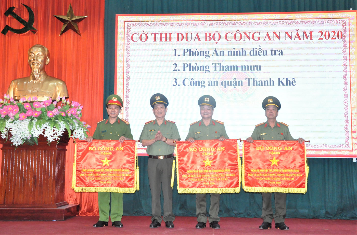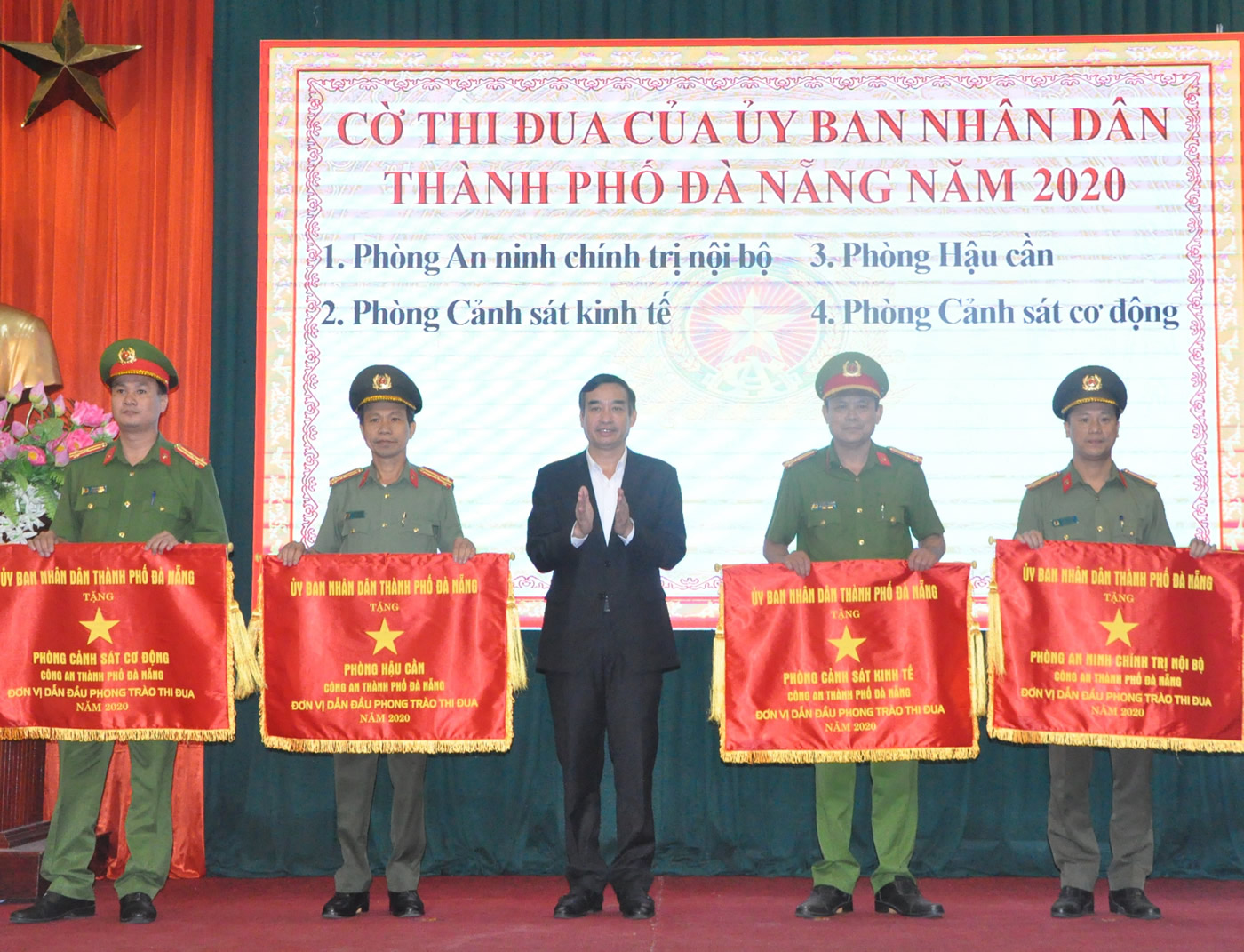 Chủ tịch UBND TP Đà Nẵng Lê Trung Chinh tặng Cờ thi đua cho 4 đơn vị thuộc CATP Đà Nẵng. |