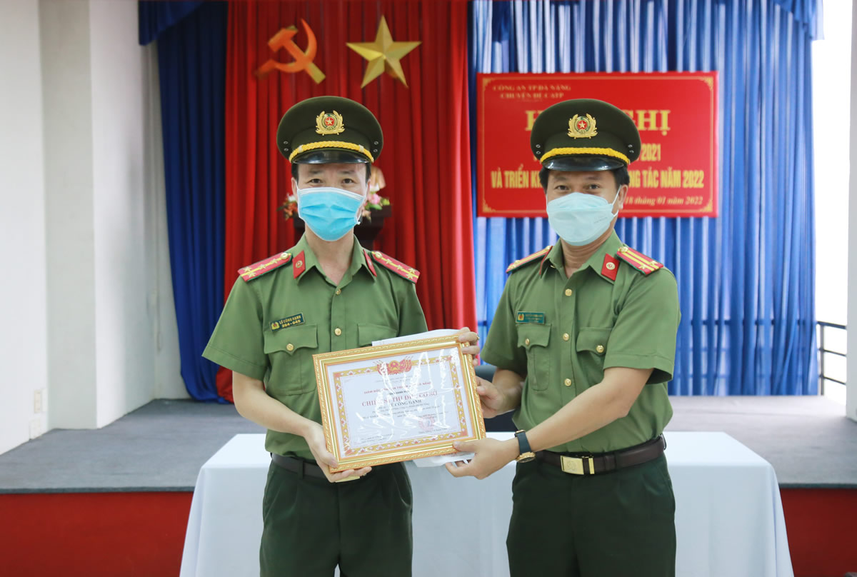 Trung tá Nguyễn Quang Sang trao danh hiệu "Chiến sĩ thi đua cơ sở" của Giám đốc Công an TP Đà Nẵng cho cá nhân. |