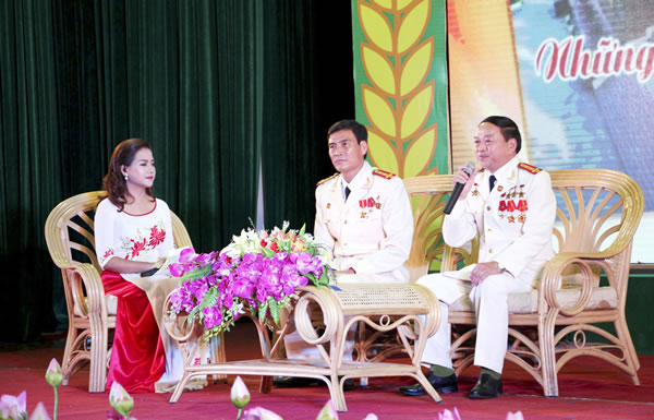 | Đại tá Nguyễn Xuân Thiêm (bìa phải) trong chương trình giao lưu "Những đóa hoa trên quê hương Bác". |