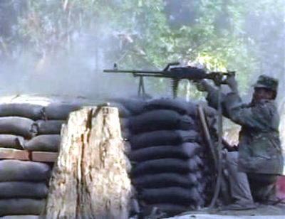 Binh sĩ Campuchia bắn trả Thái Lan từ hàng rào bao cát. Ảnh: Reuters |