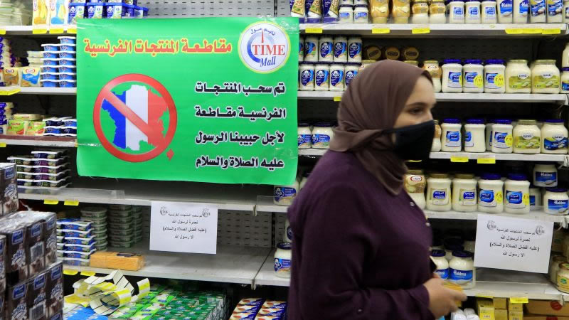 Tại một siêu thị ở Amman, Jordan, các sản phẩm của Pháp bị tẩy chay vì những tuyên bố của Tổng thống Macron về nhà tiên tri Mohammed. Ảnh: AFP |