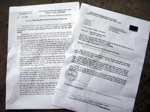 Công văn yêu cầu cải chính và xin lỗi của Báo Pháp luật TPHCM gửi Báo ĐS&PL và văn bản của Cty Luật TNHH Đông Phương Luật gửi ông Nguyễn Tiến Thanh - Tổng Biên tập Báo ĐS&PL. |