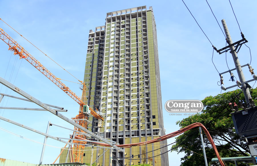 Tòa nhà Risemount Apartment Đà Nẵng đang ốp kính vàng dang dở. |